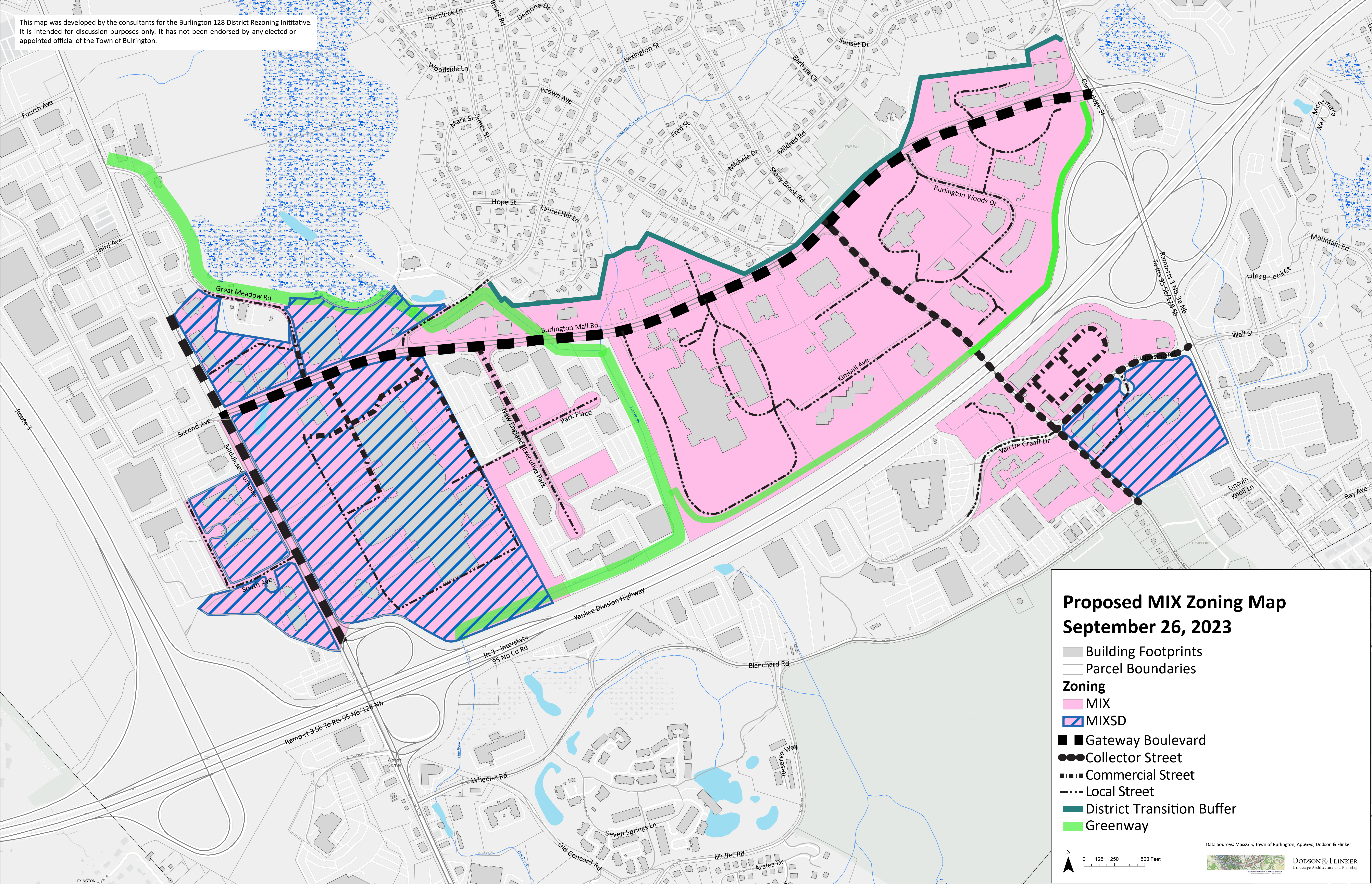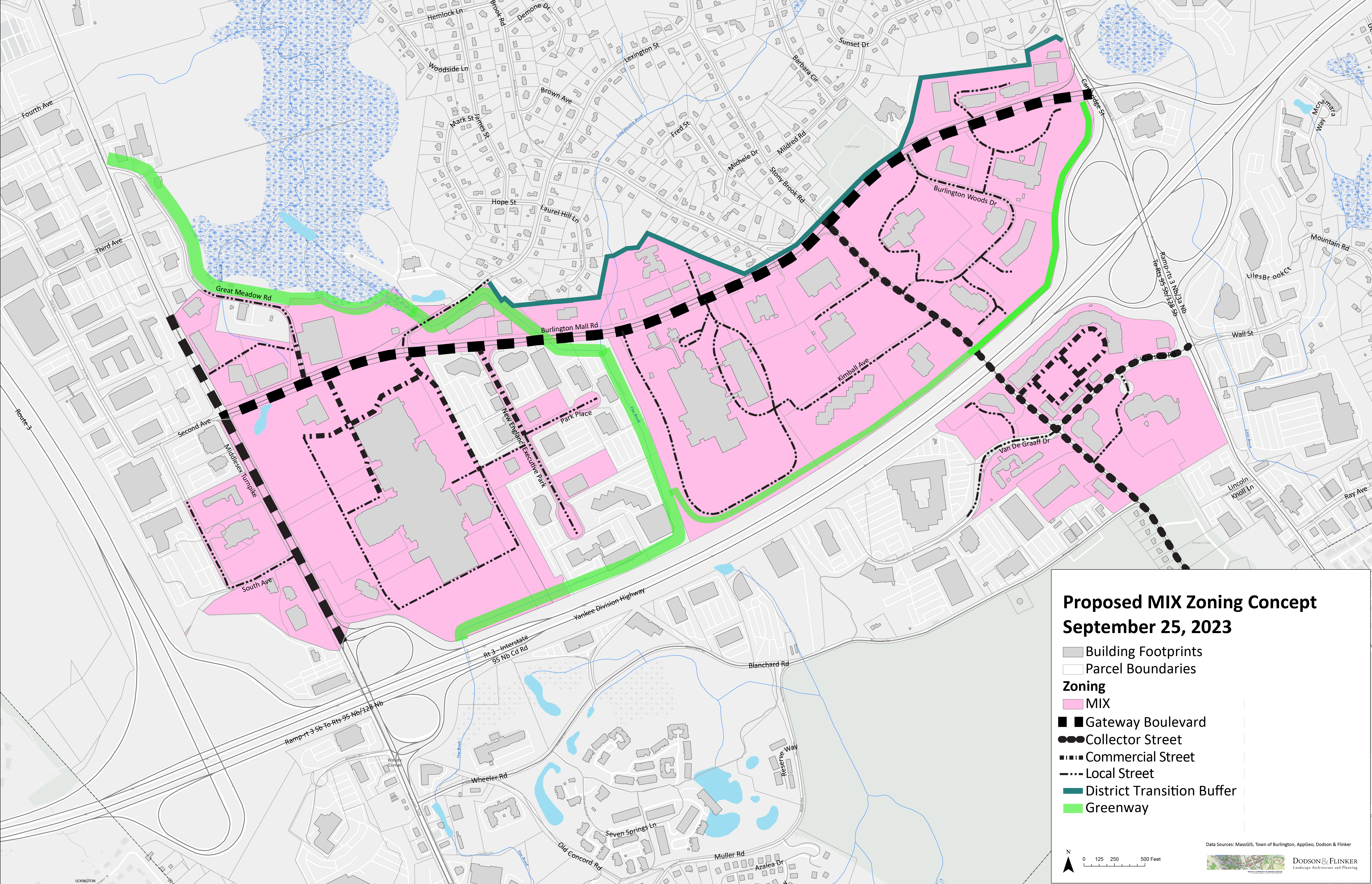 The mixed-use zoning proposal includes 117 acres of private property comprised of several parcels, including those that comprise the Burlington Mall, Kohls, and Burlington Square area.